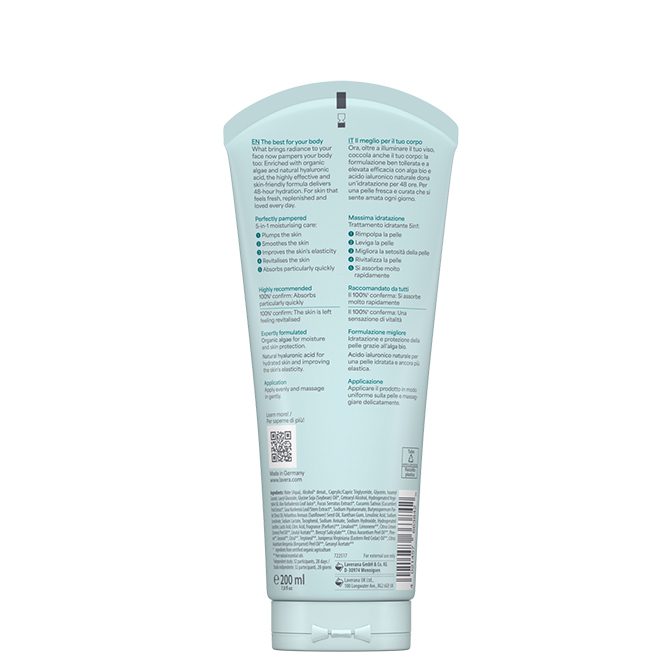 Ενυδατική κρέμα σώματος 5 σε 1 με οργανικά φύκια και φυσικό υαλουρονικό οξύ που προσφέρει 48ωρη ενυδάτωση, αναζωογονεί και βελτιώνει την ελαστικότητα της επιδερμίδας. Απορροφάται ιδιαίτερα γρήγορα, με μη λιπαρή υφή και φρέσκο, υδάτινο άρωμα.