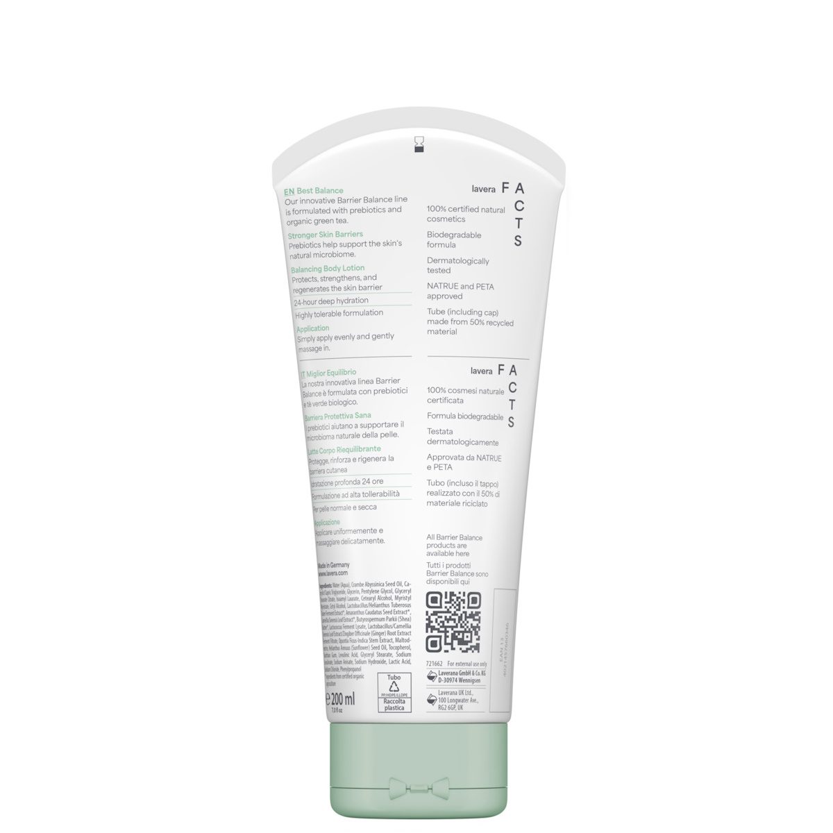 Το Balancing Body Milk προστατεύει, ενισχύει και αναπλάθει τον δερματικό φραγμό και προσφέρει 24ωρη ενυδάτωση σε βάθος – εντελώς χωρίς άρωμα και αλκοόλ. Το Barrier Balance Body Milk ενισχύει τον δερματικό φραγμό και υποστηρίζει το μικροβίωμα. Η σύνθεση με πρεβιοτικά συστατικά και Βιολογικό Πράσινο Τσάι εξισορροπεί τη χλωρίδα του δέρματος και προσφέρει 24ωρη εντατική ενυδάτωση σε κανονικό έως ξηρό δέρμα. Εντελώς χωρίς άρωμα και αλκοόλ.
