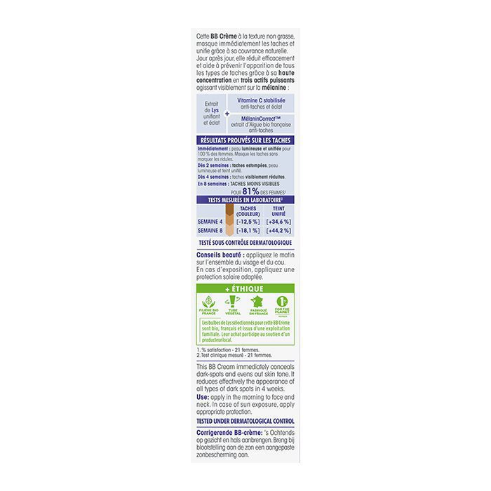 Η BB Κρέμα Correctrice LUMI’LYS [C] προσφέρει άμεση κάλυψη κηλίδων και ομοιόμορφη επιδερμίδα με φυσική κάλυψη. Με ενεργά συστατικά όπως εκχύλισμα Λευκού Κρίνου, σταθεροποιημένη Βιταμίνη C και MélaninCorrect®, προστατεύει και μειώνει ορατά τις δυσχρωμίες, χαρίζοντας φωτεινή και ομοιόμορφη επιδερμίδα.