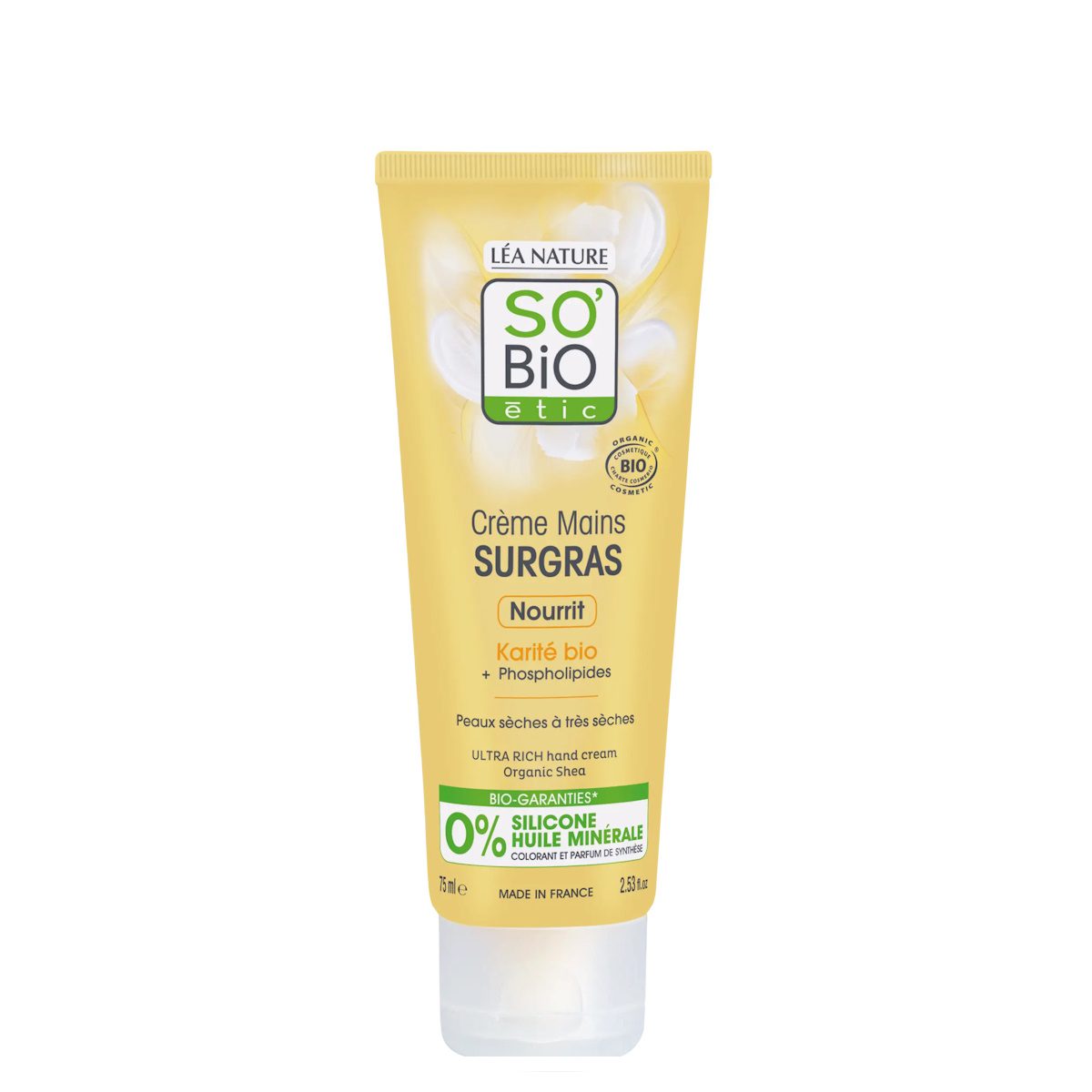 Αυτή η εξαιρετικά πλούσια κρέμα χεριών χωρίς σιλικόνη, με σύνθεση από βιολογικό βούτυρο καριτέ και φωσφολιπίδια, θρέφει το ξηρό και πολύ ξηρό δέρμα. Καταπραΰνει την ξηρότητα, αφήνοντάς το πιο λείο και απαλό.